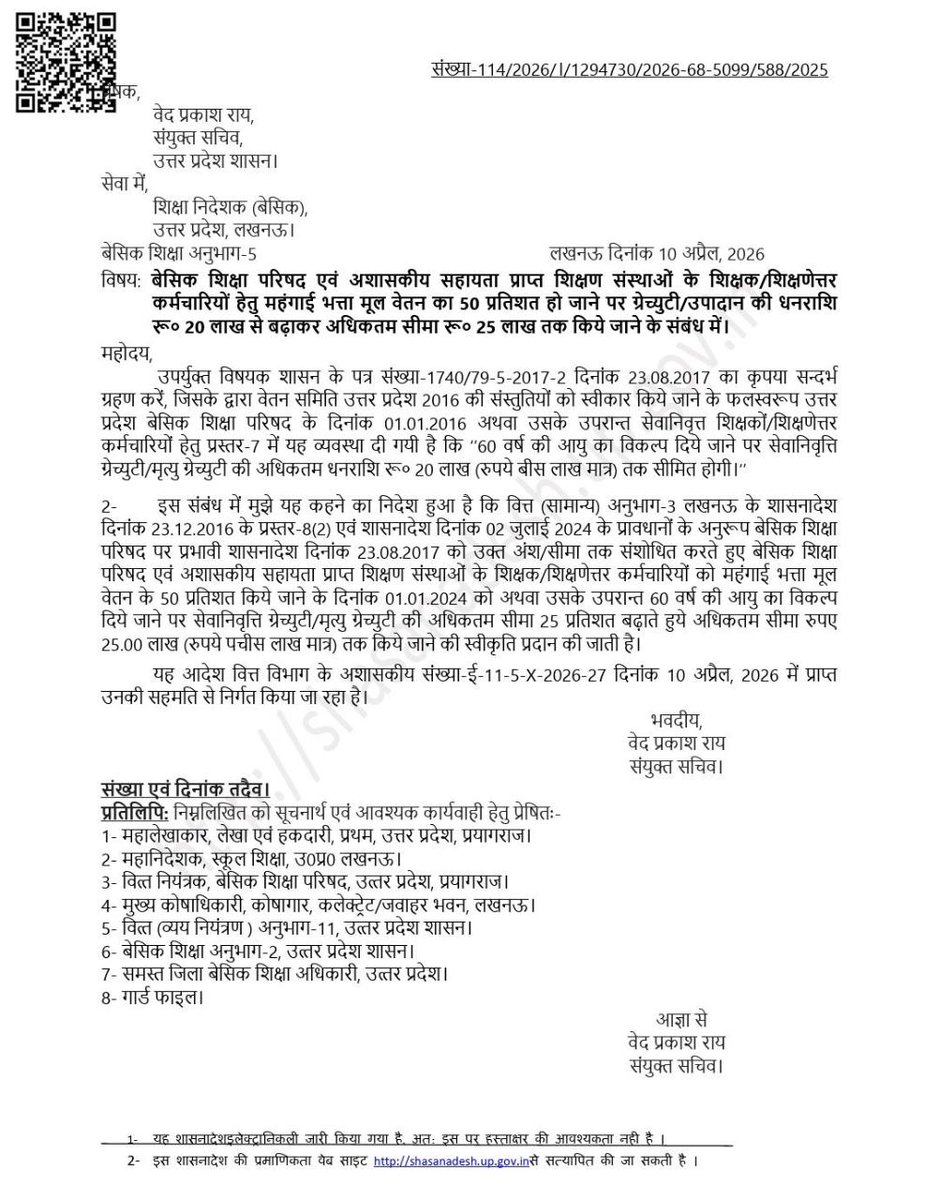 लखनऊ: बेसिक शिक्षा परिषद एवं अशासकीय सहायता प्राप्त शिक्षण संस्थाओं के टीचर्स/ शिक्षणेत्तर कर्मचारियों हेतु महंगाई भत्ता का 50% हो जाने पर ग्रेच्युटी/ उपादान की धनराशि ₹ 20 लाख से बढ़ाकर ₹ 25 लाख किए जाने के संबंध में आज का आदेश। #LucknowUpdate #TeacherBenefit #GratuityHike
