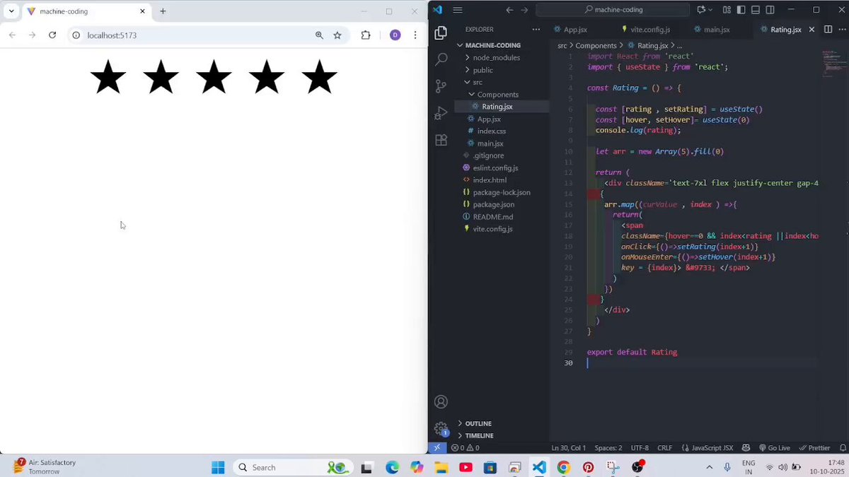 Started my Machine Coding Round Series 🚀 Day 1 – Built a 5★ Rating Component using React & Tailwind 💻 Learning how to turn ideas into clean, reusable UI 💪 #MachineCoding #ReactJS #Frontend #tailwind