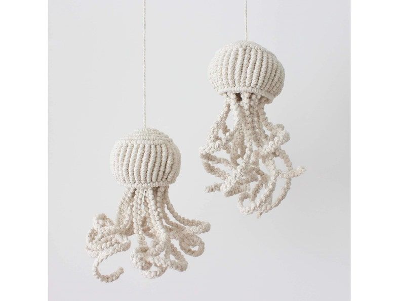 These Macramé Jellyfish Look Like They're Actually Floating - And There's A Pattern: 👉 tidd.ly/4bJvxBf - by Marie of Pelote & Compagnie 💜 #macrame #fiberart #etsy #affiliate #home #diy #giftideas