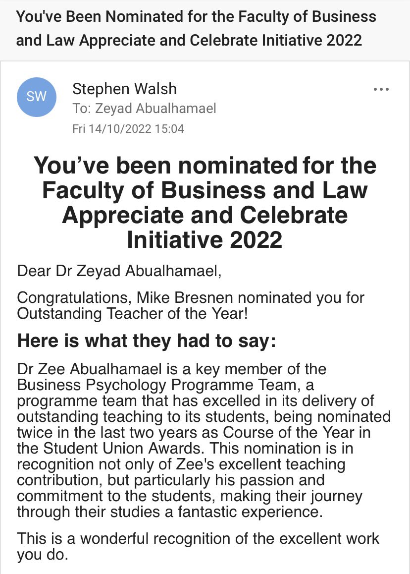 Successful people are not gifted; they just work hard, then succeed on purpose. هذا من فضل ربي، تم ترشيح صباح اليوم كأفضل دكتور لسنة ٢٠٢١-٢٠٢٢ في كلية الادارة والاقتصاد في جامعة مانشستر ميتروبوليتان #manmet #manchestermetropolitan @mmu_business @TheUnionMMU @MMU_PP