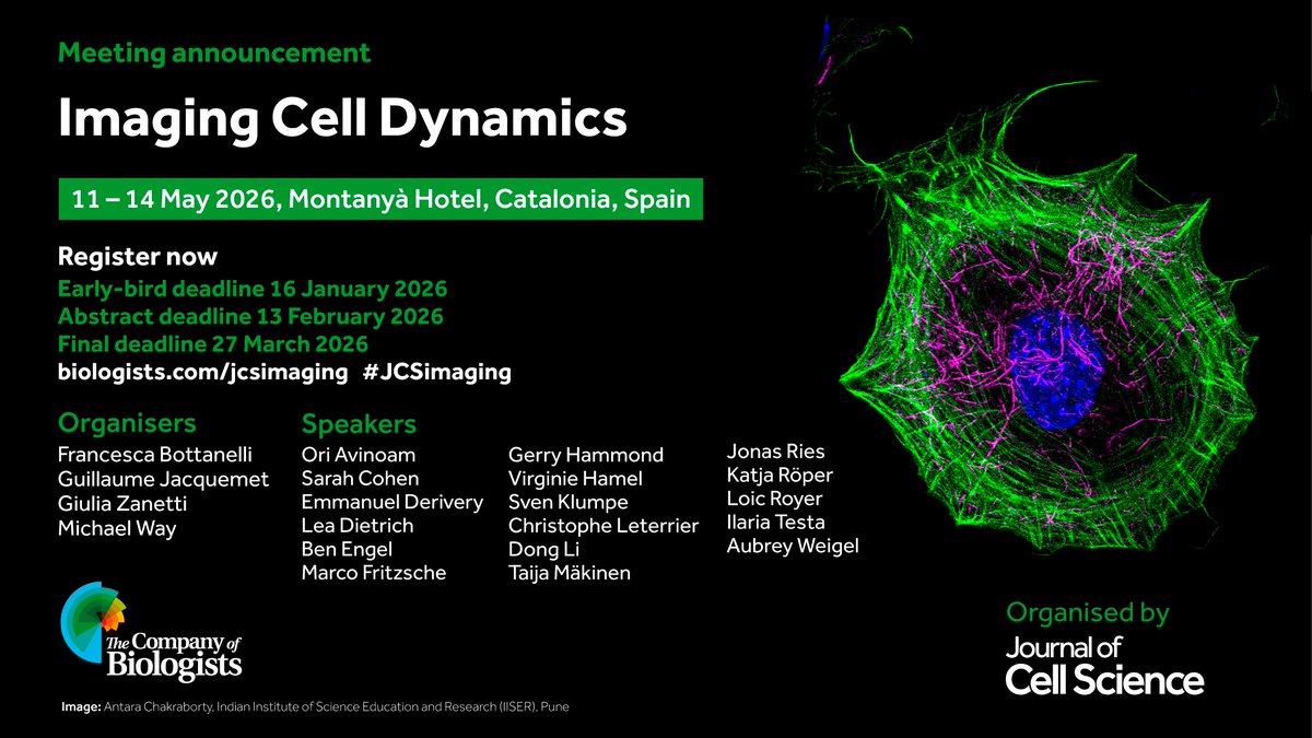 Registration for our Imaging Cell Dynamics meeting is still open! Organised by Francesca Bottanelli, Guillaume Jacquemet, Michael Way and Giulia Zanetti. Find out more: biologists.com/meetings/jcsim… Early-bird deadline: 16 January #imaging #microscopy