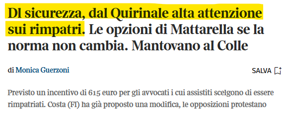 Sulle agenzie filtra l'attenzione del #Quirinale sulla norma del #decretosicurezza con un incentivo di 615 euro per gli avvocati che seguono una pratica di rimpatrio volontario di #migranti. Per far chiarezza un odg potrebbe non bastare, e la firma di #Mattarella non è scontata
