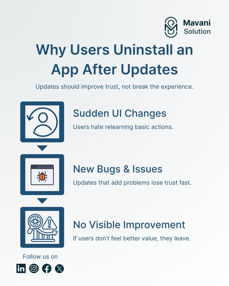 Why do users uninstall after app updates? ❌ Sudden UI changes ❌ New bugs ❌ No visible value Users keep apps when updates feel better, easier & useful. #MavaniSolution #MobileAppDevelopment #AppUpdates #UserExperience #UserRetention #AppDevelopment