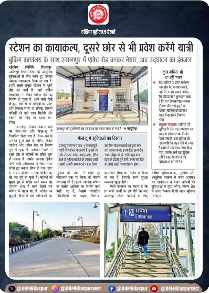उस्लापुर स्टेशन का कायाकल्प,अब यात्री दूसरे छोर से भी कर सकेंगे प्रवेश। बुकिंग कार्यालय के साथ नया एप्रोच रोड तैयार — यात्रियों की सुविधा और सुगमता के लिए दक्षिण पूर्व मध्य रेलवे का एक और कदम। #UslapurStation #StationDevelopment #ModernStation #BilaspurDivision