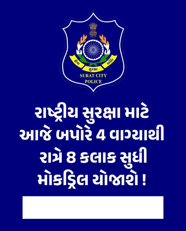 રાષ્ટ્રીય સુરક્ષા માટે આજે બપોરે 4 વાગ્યાથી રાત્રે 8 કલાક સુધી મોકડ્રિલ યોજાશે ! #mokdrill #mokdrill7may #suratcitypolice