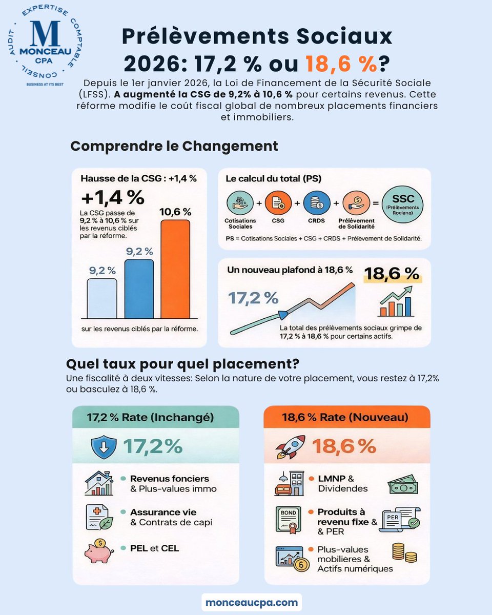 🇺🇸 📊 Social taxes 2026: 17.2% or 18.6%? CSG increase is a game changer. 👉 Real estate & life insurance: 17.2% 👉 Dividends, crypto, LMNP: 18.6% ⚠️ Two-tier tax system impacting your returns. Which side are you on? 👇 #monceaucpa #tax #CSG