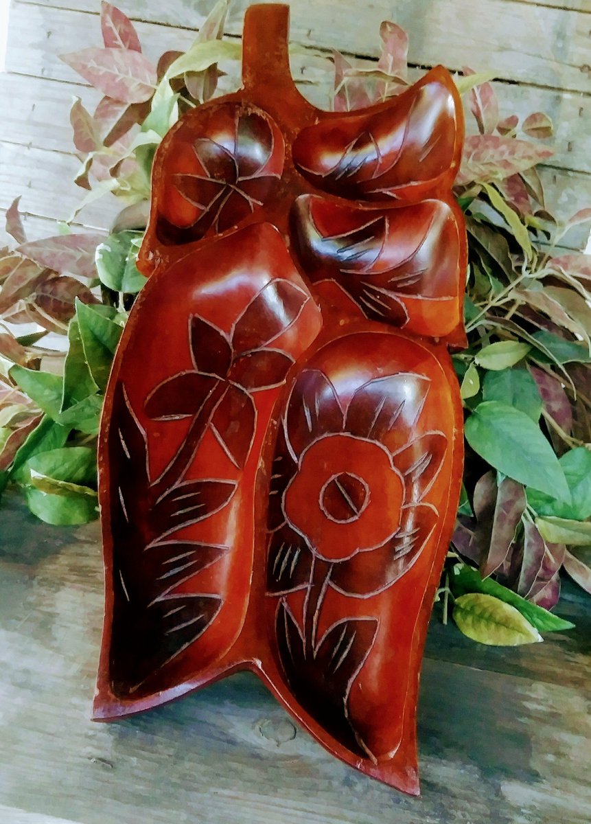 WOW this monkey pod decorative tray is Unbelievable! % sections, each one carved with a tropical floral design, the carving continues on the sides, and reaches around the back which depicts two palm trees and a hut! It is GORGEOUS! #monkeypod, #carved #etsy