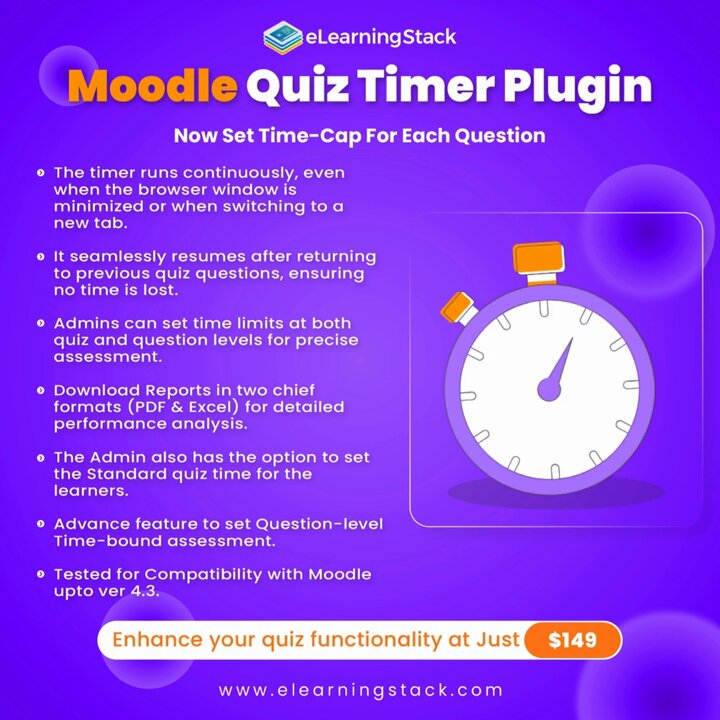 Moodle Quiz Timer Plugin Keep learners focused and on schedule with Moodle’s Quiz Timer Plugin — a smart way to set precise time limits for assessments and boost performance. 🔗 To get the plugin, elearningstack.com/product/moodle… #moodlequiztimer #elearningstack #moodleplugin