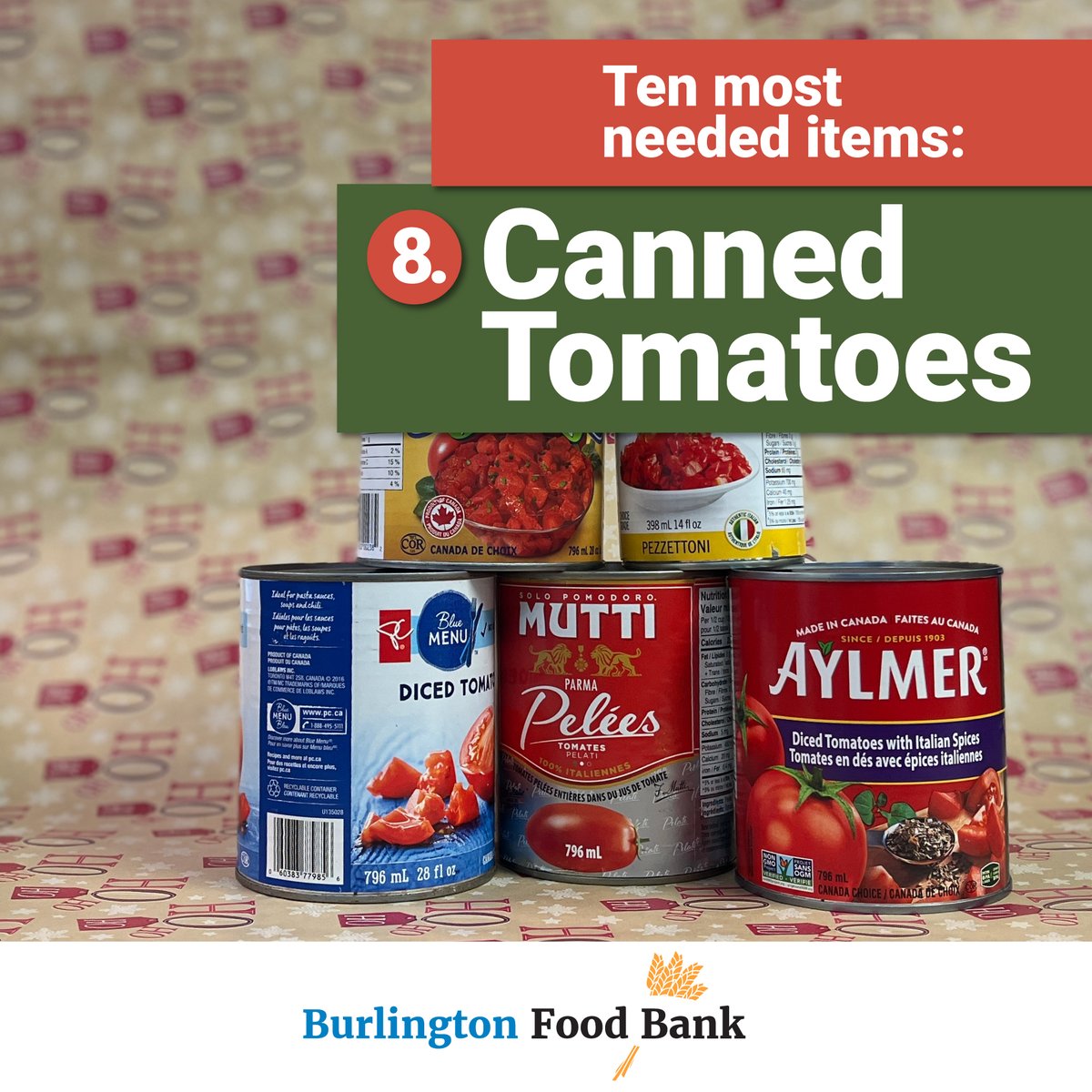 Canned tomatoes are in at #8 on our Ten Most Needed Items list. Canned tomatoes make a great base for so many soups, stews and sauces. Tomatoes are rich in vitamin C and contain small amounts of vitamin A and potassium. #mostneededitems #BurlingtonFoodBank #tistheseason