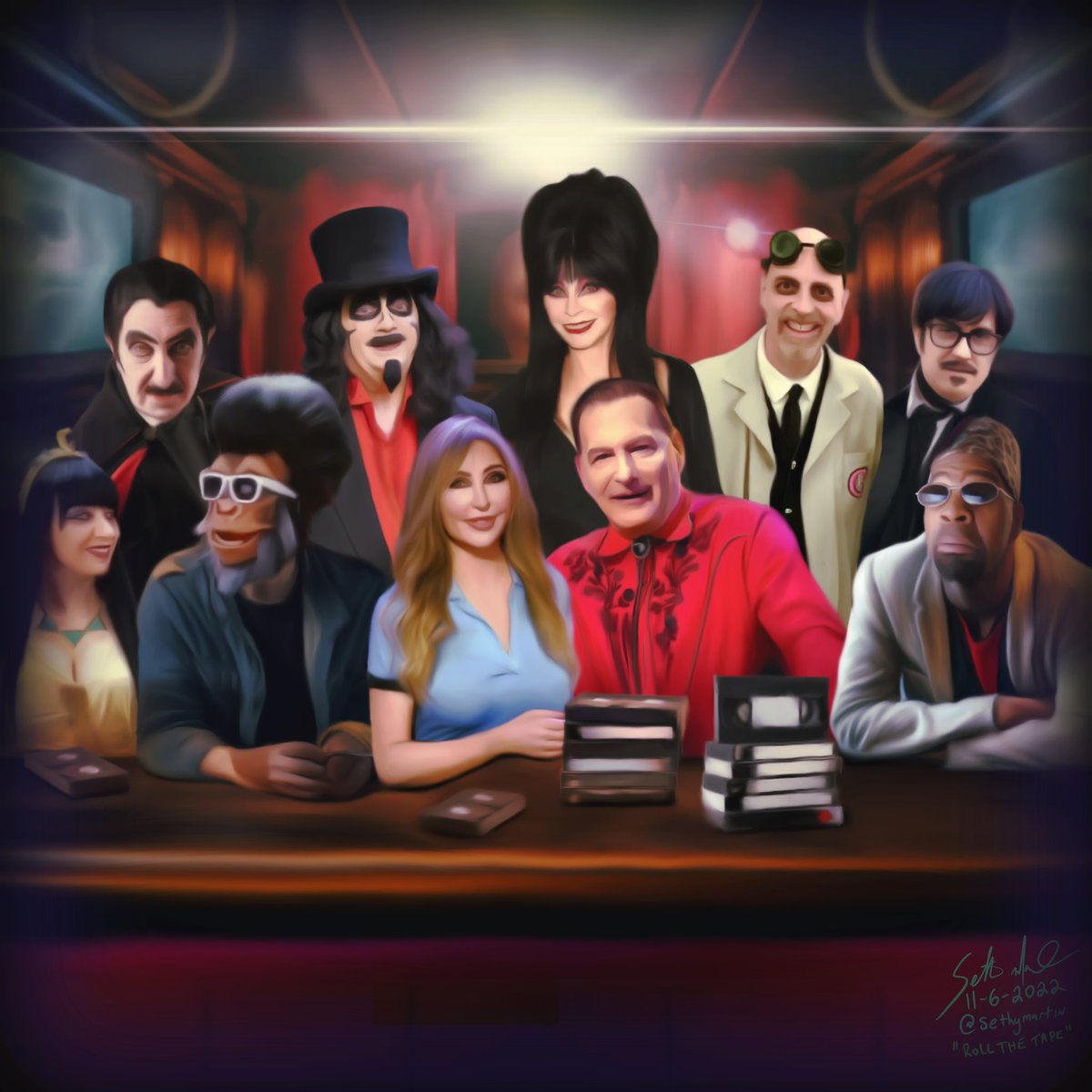 New Painting by Me “Roll the Tape” @therealjoebob @kinky_horror @CountGore @Svengoolie #elvira @drgangrene #MrLobo #drsarcofiguy #themummyandthemonkey