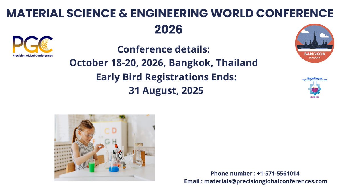 🌟 Don’t miss out! Join us at the Material Science & Engineering World Conference 2026 📅Oct 18–20, 2026 📍Bangkok, Thailand 👉Link: tinyurl.com/MSEWCR2026 ✅ Early Bird Registration Ends: 31 Aug, 2025 #MSWC #MaterialsScience #EngineeringInnovation #Global #BangkokConference