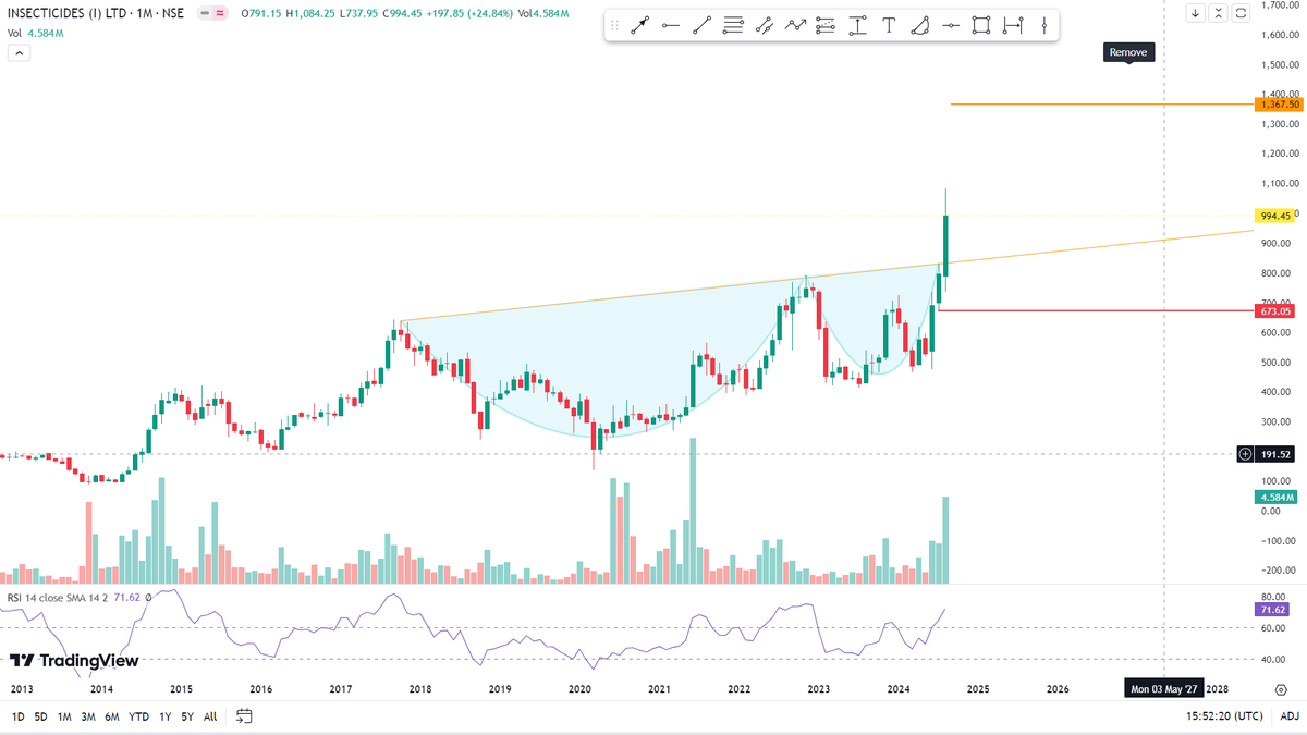 📌24 #MultiYear Breakout Charts for August 2024 Close (A Thread)🔖 Please Bookmark & retweet! :) 1. #INSECTICID MONTHLY CHART CMP 994 Join us on telegram t.me/thebullishbreak for detail views! @Rishikesh_ADX @ADX_Learner @preet2419 @Chart_Wallah108 @ArindamPramnk