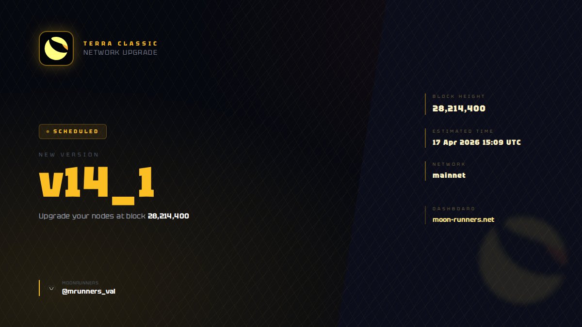 ⏰ Terra Classic upgrade in ~24h! Version: v14_1 Block: 28214400 Est. time: 17 Apr 2026 15:09 UTC moon-runners.net/terra/mainnet #CosmosEcosystem #NodeUpgrade