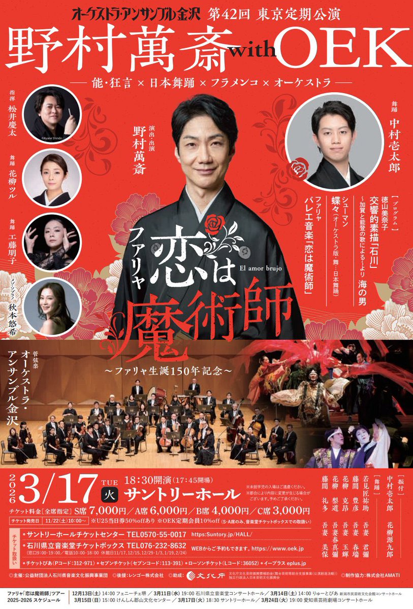 【当日券情報】 明日第42回東京定期公演 3月17日(火)18:30開演 サントリーホール 当日券17:45より会場にて C席(P,RA,LAブロック)のみ若干🤏発売します🎫‼︎ 18:30開演です⚠️⚠️ グッズ販売🐜〼❗️❗️ #ファリャ_萬斎のおもちゃ箱 #野村萬斎 #oek #サントリーホール