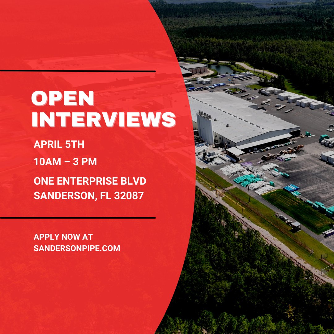 #SandersonPipe is hosting an #openinterview at our #Florida location. Please #joinus on April 5th at 10am-3pm at One Enterprise Blvd. #SandersonFL Get ahead of the game and #Apply #applyonline now at sandersonpipe.com #interviews #jobs #jobsearch #employment #ApplyNow