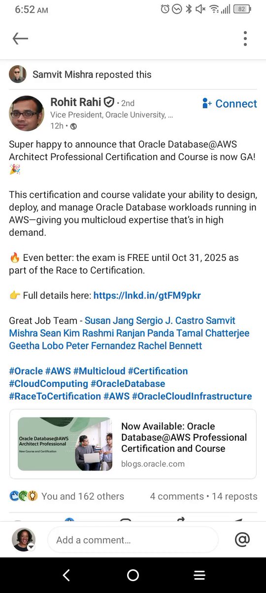 #BreakingNews: @OracleCloud has just released its new Oracle Database@AWS Architect Professional course and certification! AND...you can take it for FREE now through October 31, 2025 during the Oracle 2025 Race to #Certification. blogs.oracle.com/oracleuniversi… #oraclecloud
