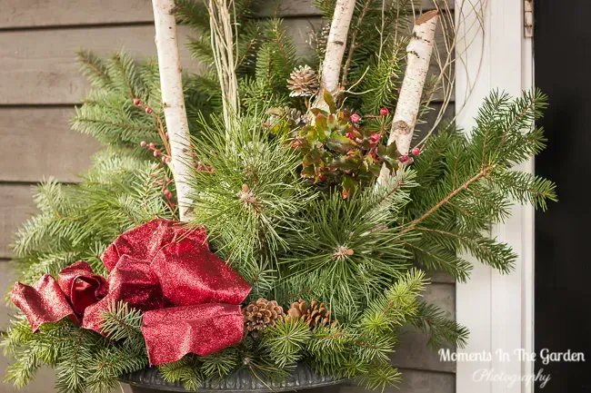 Onto some more outside Christmas decor. My outside container has soil in it so it is easy to plant branches of fir and pine along with birch branches plus a few embellishments. #outsidecontainer #freshgreenery #outsidechristmasdecor #fir #pine #momentsinthegardenphotography