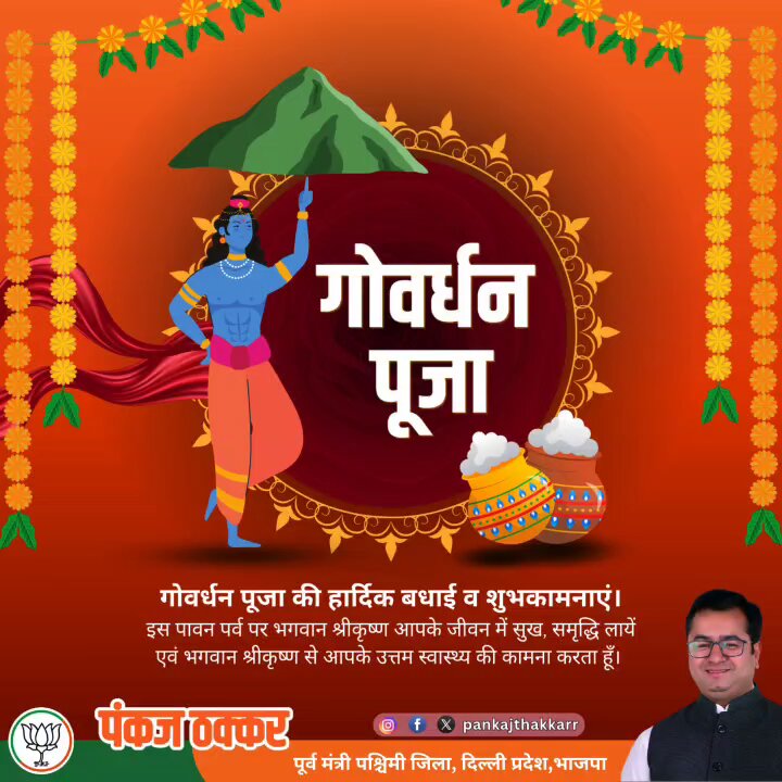 प्रकृति और गोवंश संरक्षण के प्रतीक #गोवर्धन पूजा की हार्दिक शुभकामनाएँ 🙏 भगवान #श्रीकृष्ण आपके जीवन में सुख, समृद्धि, स्वास्थ्य लाएँ एवं भगवान श्रीकृष्ण से आपके उत्तम स्वास्थ्य की कामना करता हूँ। जय श्री गिरिराज धारण! जय श्री कृष्ण! #pankajthakkar #BJP4Delhi #Goverdhan