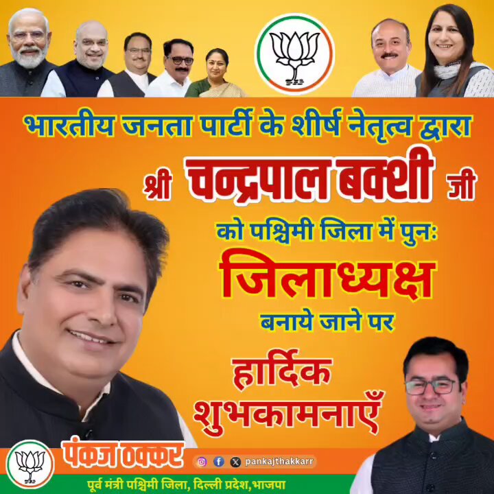 भारतीय जनता पार्टी के शीर्ष नेतृत्व द्वारा श्री चंद्रपाल बक्शी जी को पश्चिमी जिला में पुनः जिलाअध्यक्ष बनाए जाने पर हार्दिक शुभकामनाएं। #pankajthakkar #pankjthakkarr #पंकजठक्कर #BJP #बीजेपी #भाजपा