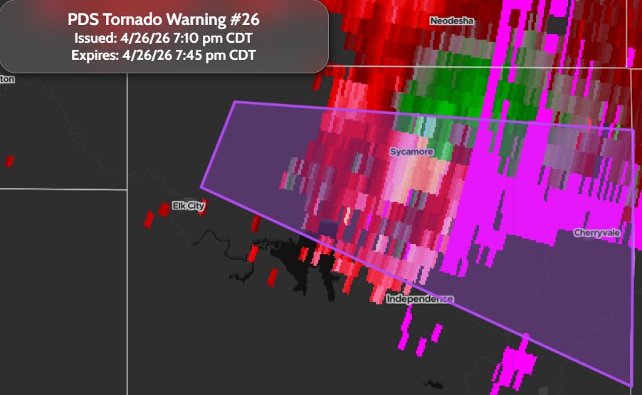 #PDS #TornadoWarning 026 has been issued for Cherryvale KS and Sycamore KS until 7:45 pm CDT #wxtwitter #wxX #wx #severewx #severe #severeweather #EnhancedRisk #TornadoAlley #kswx #KSwx #Tornado Damaging tornado #Hail Two inch sized possible ⚠️This is a Life Threatening