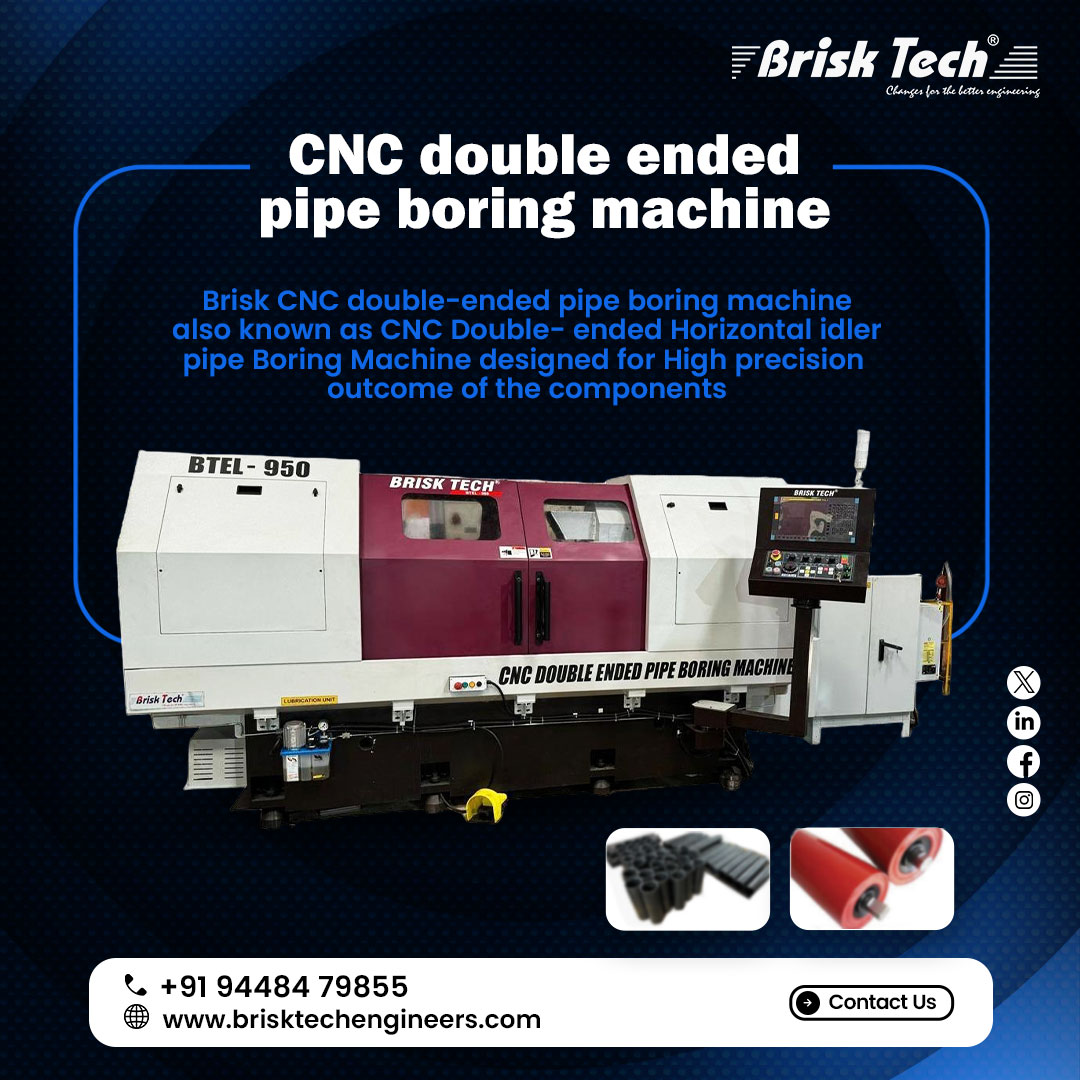 CNC Double Ended Pipe Boring Machine Brisk CNC double-ended pipe boring machine also known as CNC Double-ended Horizontal idler pipe Boring Machine designed for High precision outcome of the components. ๐ brisktechengineers.com #cncmachine #pipeboringmachine #machinesupplier