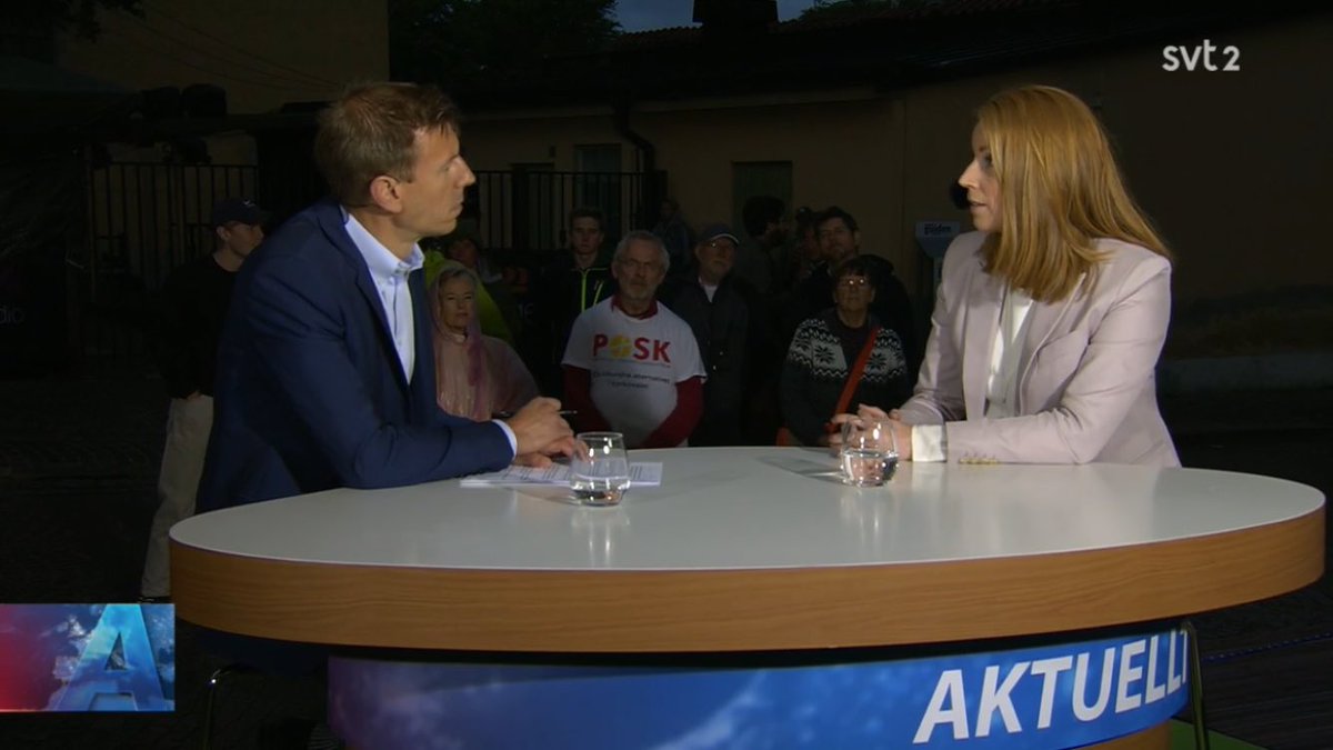 Pajade studiolampor i @svtnyheter Almedalspaviljong ger ett träffande bild av ämnet för dagen, där @annieloof ska skärskåda de mörka krafter som sätts i omlopp när @BuschEbba äter lunch med @jimmieakesson #köttbullar #potatis #lingon #lättöl #svpol