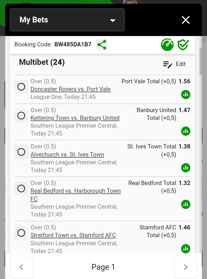 Here is our Saturday's 17:00 #PowerHour - 29 Legs only: BW46AFC9CB, 300 Odds, Full-Time over 1.5 Goals BW46B3F0C3, 8000 Odds, Home/Away over 0.5 Goals. I will do combined markets during the day tomorrow.