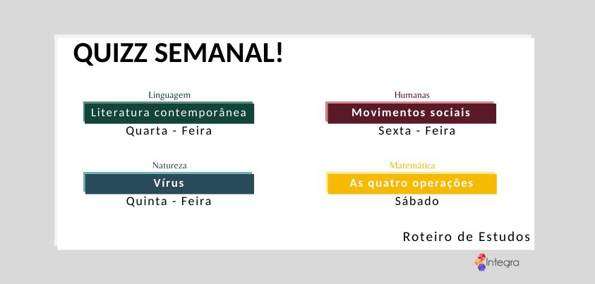 Agora teremos os amados quizzes por aqui também! Quem tá preparado pra gabaritar? Segue a programação da semana: #Enem2020 #PréEnem