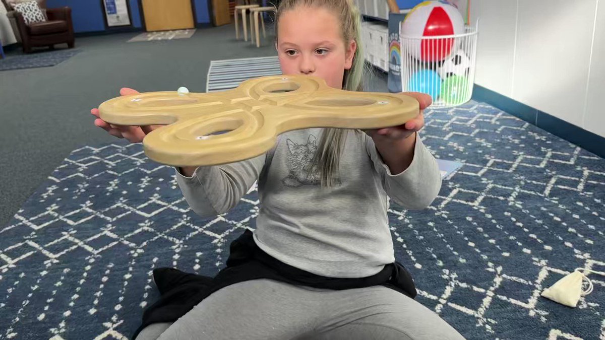 Working on functional vision (eyes working together as a team) We can use the infinity loop ♾️ marble board or cloverleaf 🍀 marble board (seen here). Look closely- her eyes 👀 following the marble- left, right, far and near. .#brainfundamentalsllc #primitivereflexexercises