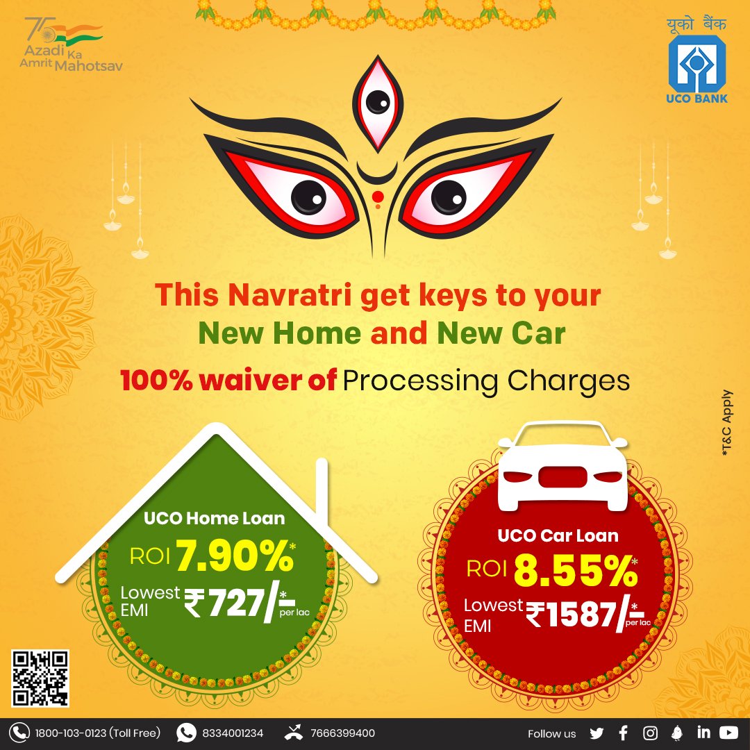 Hey! Festive season is on!! Make this Navratri a memorable one. Buy your dream home and car with UCO Home & Car Loan at Zero #ProcessingCharges. Click bit.ly/UCObkln to apply. #UCOBank Honours Your Trust #AmritMahotsav