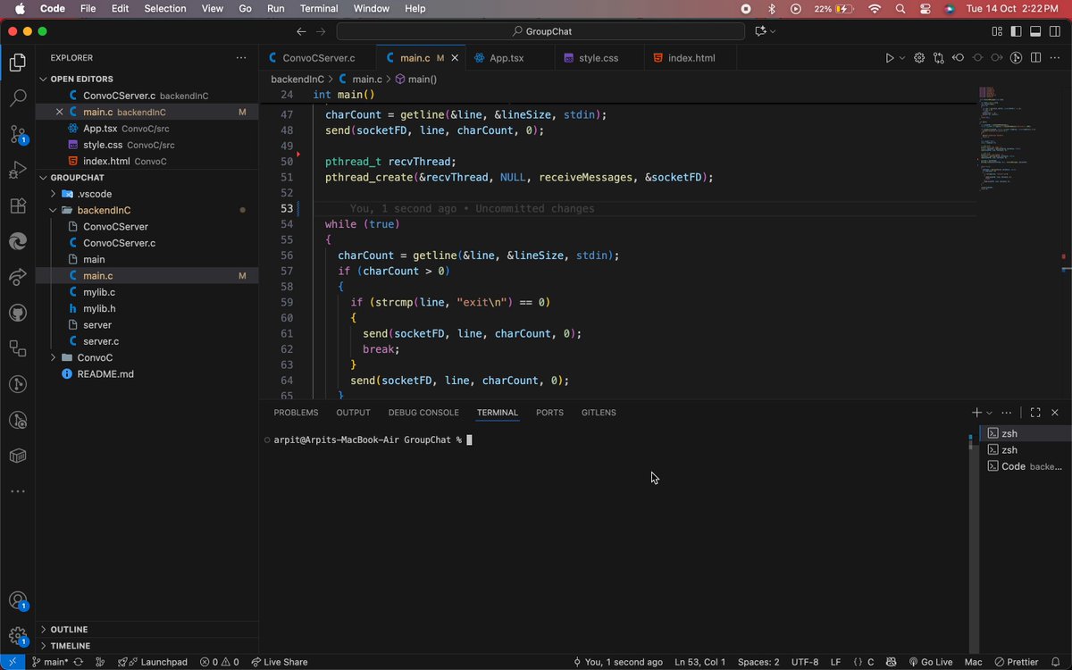 Just made a group chat application with backend completely in #C. Multiple terminals can talk to each other over #TCP. Used #pthreads for concurrency. #tech #code #coding #programming #SoftwareDevelopment #WinterArc