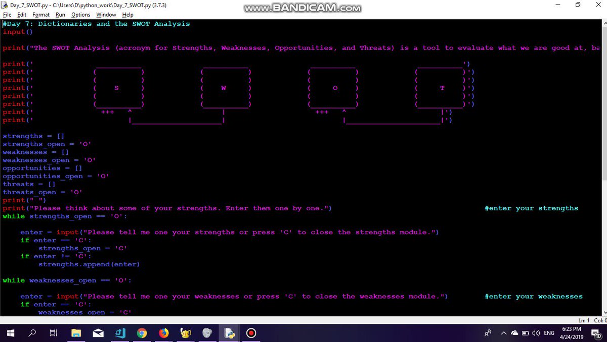 Day 7 Learning Python! #100DaysofCode #PythonNewbie I Thought I would use a dictionary but a list worked better for this purpose. SWOT Analysis! ☑️used append() to put user data into a list ☑️' ,'.join to remove quotes upon output ☑️len() to return length of a string
