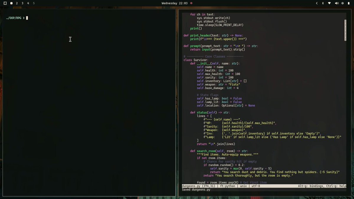 I'm building a simple, atmospheric Python text-RPG where sanity drains in the darkness and a Warden guards the exit. #Coding #PythonProject #TextRPG