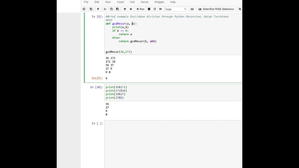 Euclidean division through Python Recursion, A brief explanation Don't worry a great deal of very smart people have a tough time with this concept. Here is the function explanation in under 60 sec. #euclidean #pythonrecursion #explanation def gcdRecur(a, b):