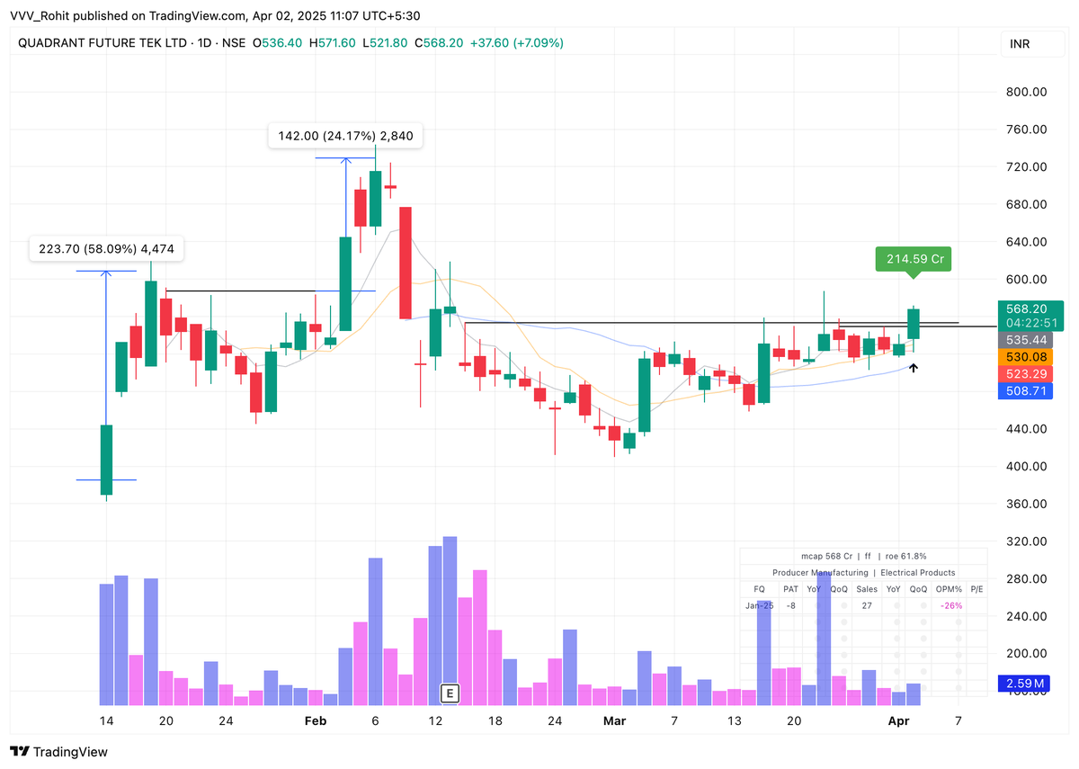 Bought #QuadFuture at an Avg of 551.2 - Perfect IPO Base with clean past attitude of moves - Liquidity Rush of 205 Crores ( Massive ) - Recent failed attempt + Consolidation at highs. - Power packed candles in recent base + High RS 10000 Qty so far will add if it does well