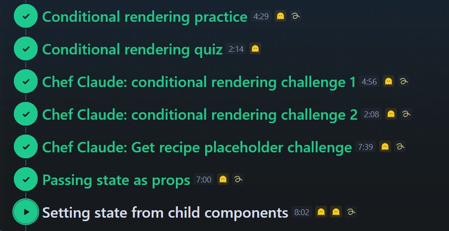 Day 94 of #100DaysOfCode — Mon, 13.04.26 Dev → Conditional rendering practice & quiz, Chef Claude challenges, passing state as props, setting state from child components from @scrimba 's Learn React Course scrimba.com/learn-react-c0e #ReactJS #Frontend #WebDev #BuildInPublic