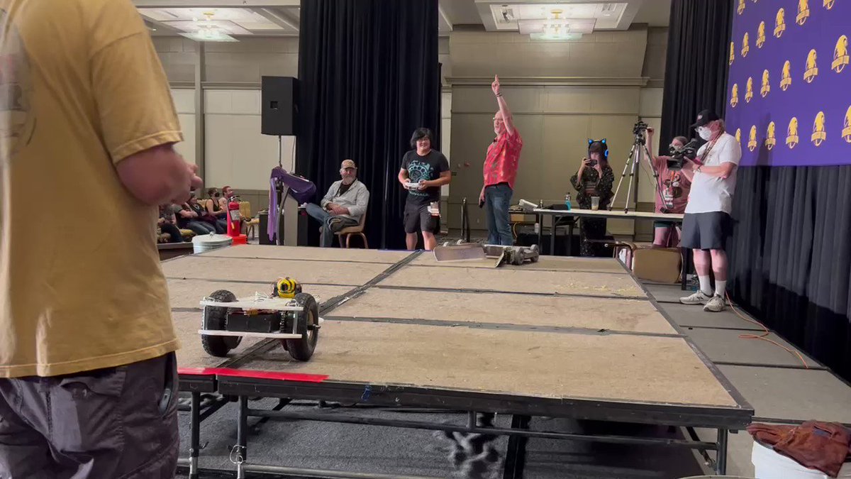 @DragonCon #robotbattles This robot is named "Rule 1.L" which states "No robot can contain any living material, like a 4 year old with a baseball bat."