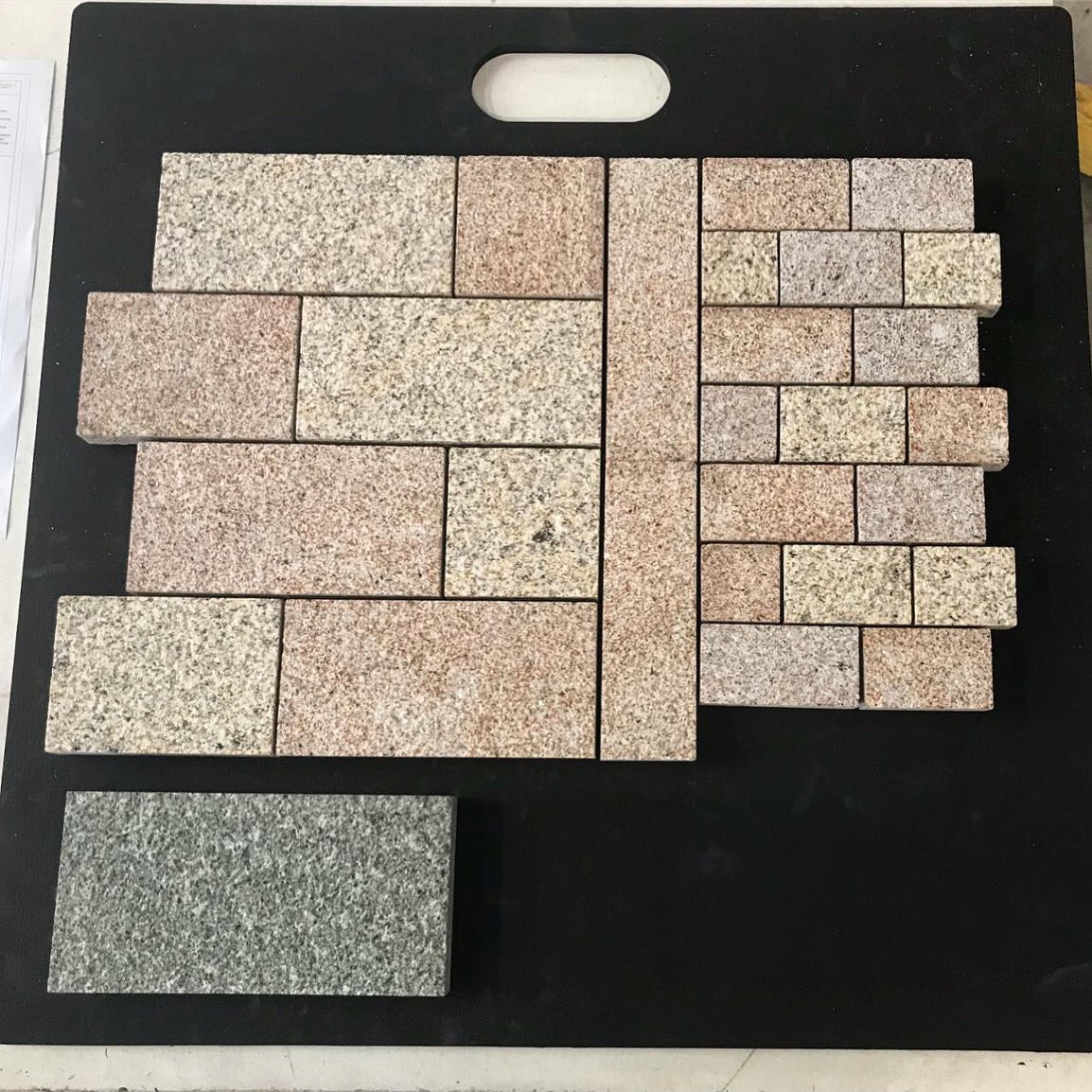 We could never get BOARD of SAMPLES, or of very bad puns 😅 this fresh granite sample board consists of a Portuguese duo of Figueiredo (flamed, bush-hammered) & Cathedral (flamed) with a solo slab of Scottish Green Schist (flamed) 🇵🇹🏴🔥 #granite #sampleboard #naturalstone