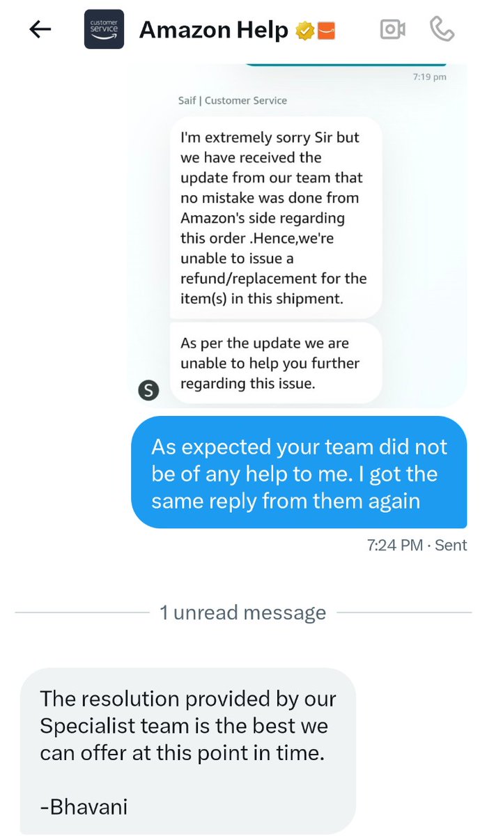 it was a high-value purchase I got at a price I won't find again. I need an urgent resolution! #AmazonIndia #CustomerServiceFail #scambyamazon I have all the conversations and proofs that Amazon have assured me. I am going to file a complaint on Amazon no matter what.