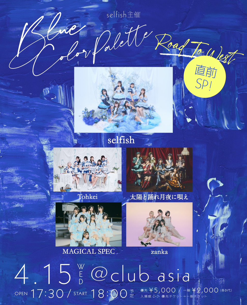 【本日開催】 selfish 主催 Blue Color Palette ROAD TO WEST 直前SP! ■ 会場:club asia ■ 時間:OPEN 17:30 / START 18:00 ■ 料金:優先¥5,000 / 一般¥ 2,000 /当日¥3,000(各D別) 前売はOPEN前17:29まで販売🐚 ticketdive.com/event/BlueColo… #selfish