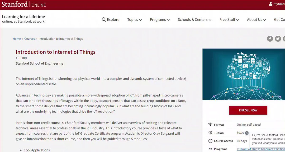 7. Introduction to Internet of Things Stanford's non-credit course on IoT's transformation, technology, and applications. You will be guided through 5 modules: • Circuits • Sensors • Networking • Cool Applications • Embedded Systems 🔗online.stanford.edu/courses/xee100…