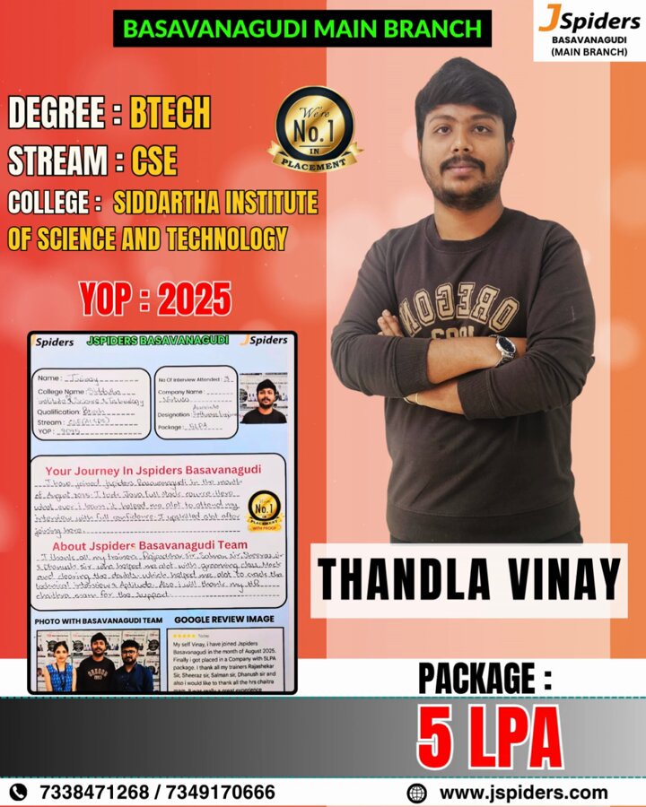 📷Congratulations THANDLA VINAY, on getting placed from JSPIDERS Basavanagudi! This is a fantastic achievement. Best of luck in your new role! 📷 #siddarthainstituteofengineeringandtechnology #jspiders #Congratulations #NewJob #SuccessStory