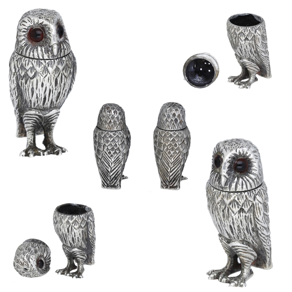 A matched pair of #owl #silvercondiments, with detachable heads and glass cabochon eyes, the pepper with maker’s mark ‘WW’, Birmingham 2005, the salt with maker’s mark ‘MS’, Birmingham, no date letter, height 5cm noonans.co.uk