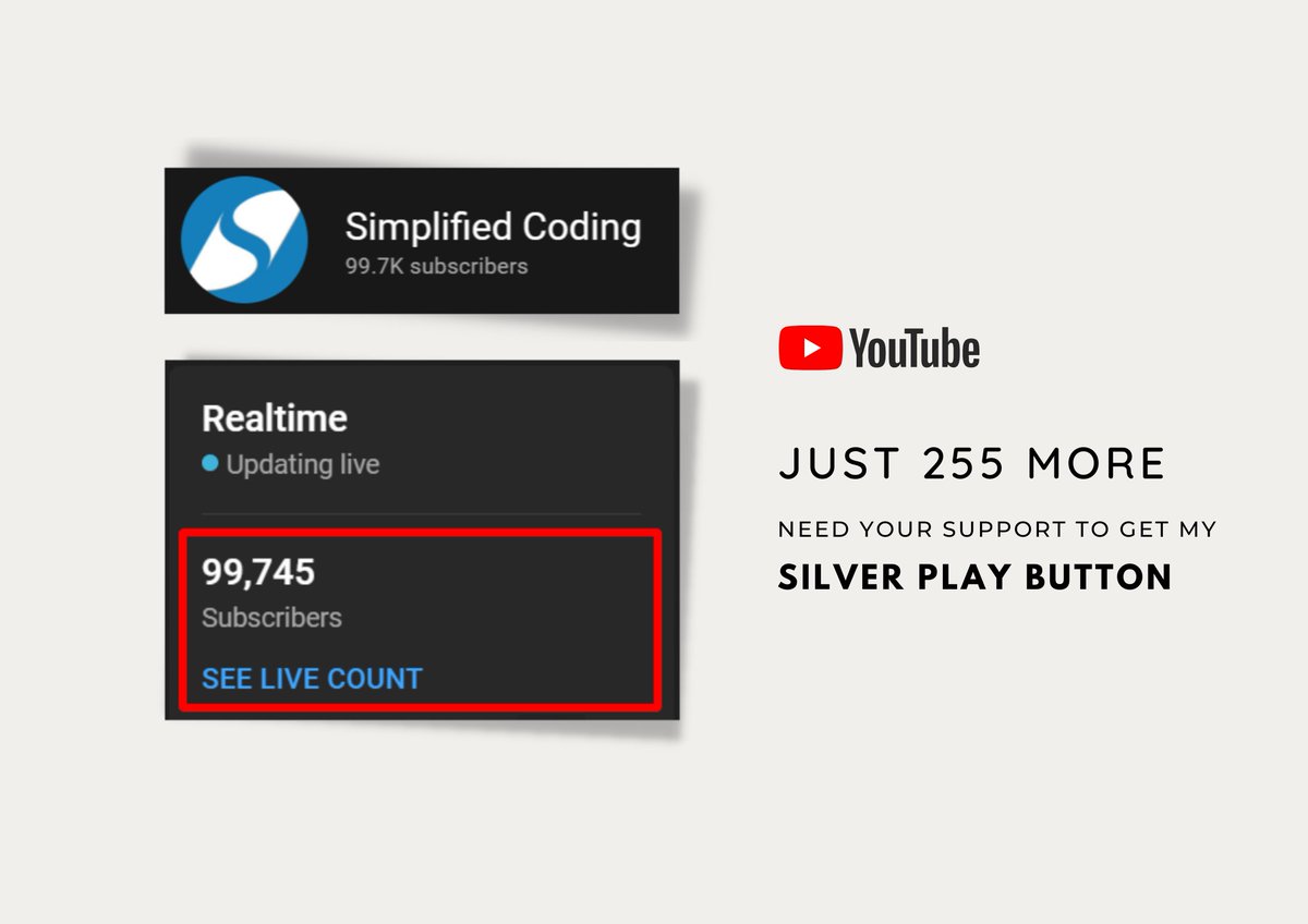 I would like to thank every person, who helped me reach 99K Subscribers โค๏ธโค๏ธ Now, please help me to quickly get my #YouTube #SilverButton Subscribe Now ๐๐ youtube.com/SimplifiedCodiโฆ Thanks again everyone ๐๐ #SimplifiedCoding #AndroidDev