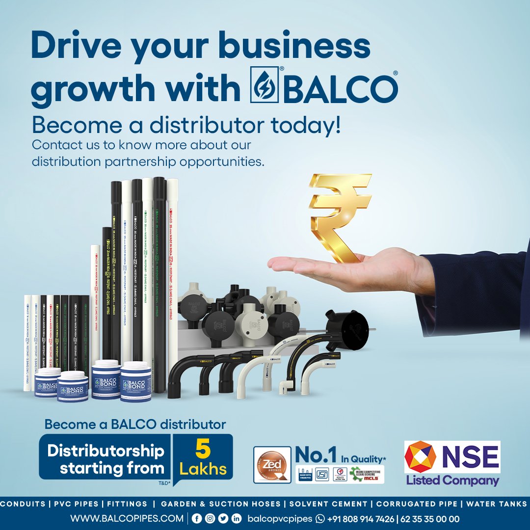 Drive your business growth with BALCO! Become a distributor today and invest in high-quality products. Contact us to explore exciting distribution partnership opportunities. Website : balcopipes.com #balco #balcopipes #solveplastics #solveplasticproducts #pvc #pipes