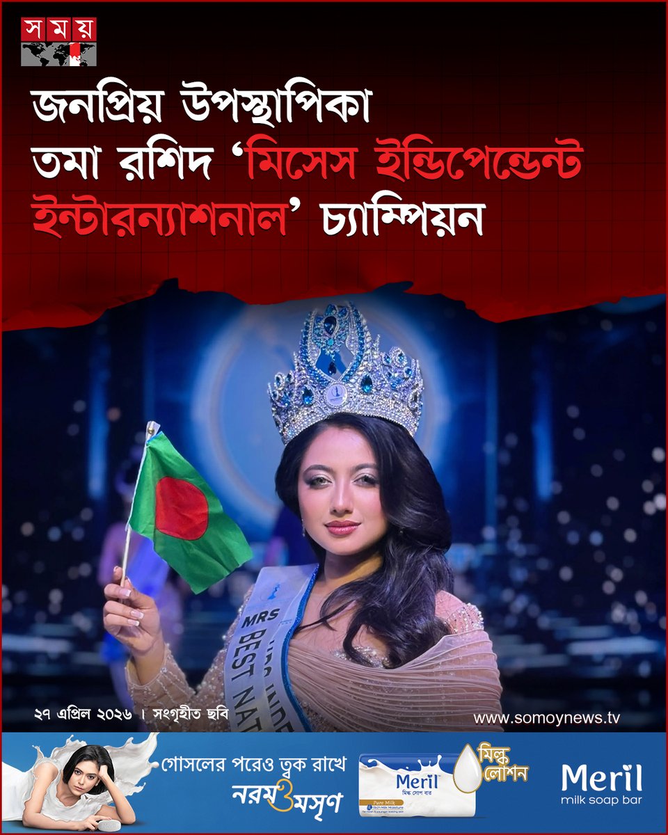 জনপ্রিয় উপস্থাপিকা ও কনটেন্ট ক্রিয়েটর তমা রশিদ প্রথমবারের মতো আন্তর্জাতিক সৌন্দর্য ও ব্যক্তিত্বভিত্তিক প্রতিযোগিতা ‘মিসেস ইন্ডিপেন্ডেন্ট ইন্টারন্যাশনাল ২০২৬’-এ চ্যাম্পিয়ন হয়ে ইতিহাস গড়লেন... বিস্তারিত : somoynews.tv/news/2026-04-2… #somoytv #NewsUpdate #entertainmentnews