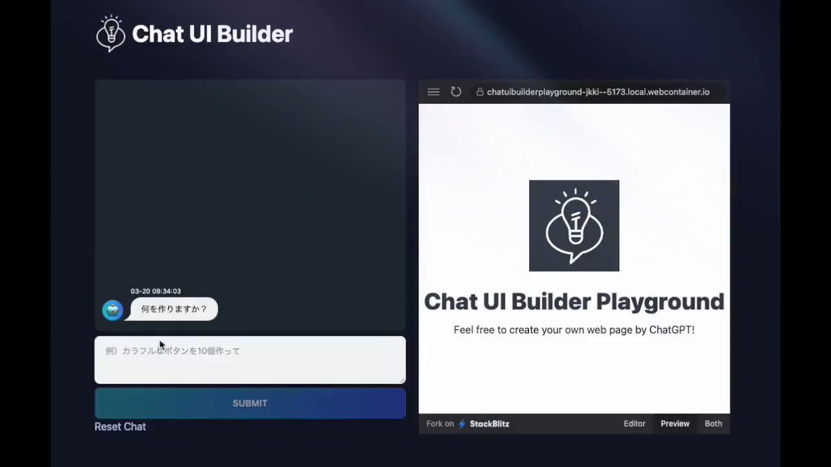 ChatGPTの出力したコードをエディタにコピペして確認するのが面倒なので、チャット形式でインタラクティブにUIを作れるツールを作ってみた 🦾 指示に従ってChatGPTが健気に作ってくれる感が結構おもしろい 内部的にはStackBlitzのEmbedを使ってる #ChatGPT #StackBlitz