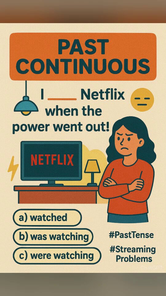 📺 Past Continuous Challenge! "I ___ Netflix when the power went out! 😑" a) watched b) was watching c) were watching 💡Hint: Which one do we use for an action that was in progress when something interrupted it? 😉 Comment your answer below! 💬 #PastTense #StreamingProblems…