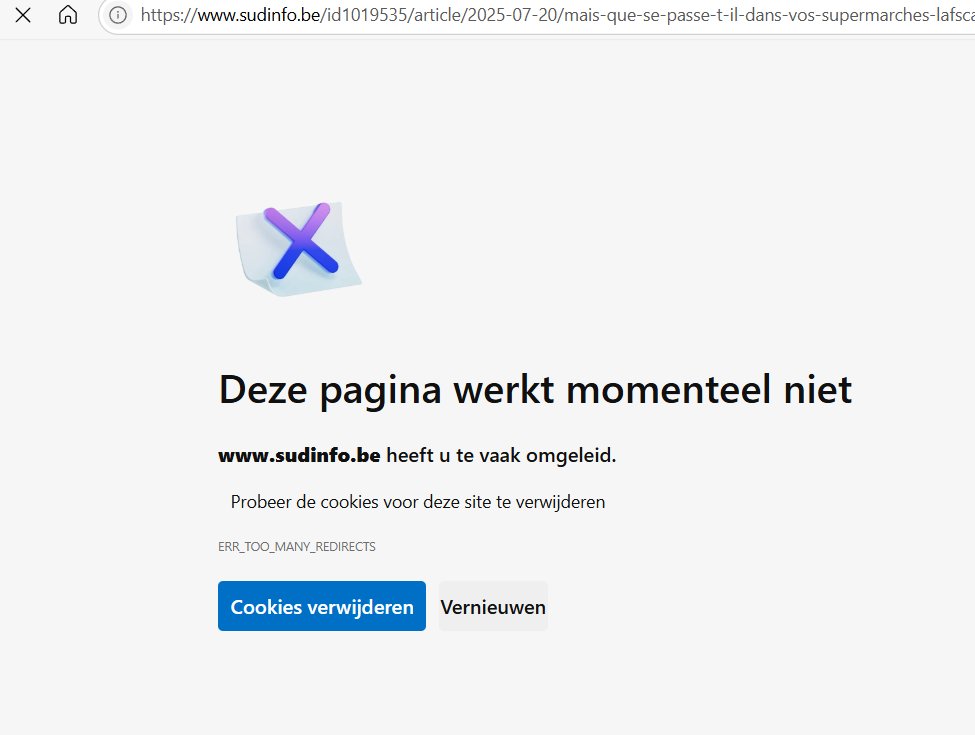 Ben geabonneerd op #Sudinfo, wil ik even 'n artikel aanklikken over hoe danig veel producten worden teruggeroepen uit de supermarkten, krijg ik onderstaand beeld. Er is niks dat werkt in de Walen. De mensen niet en nu zelfs de websites niet.