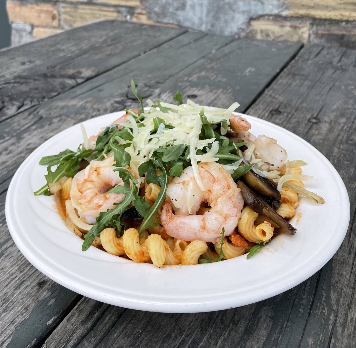 Tonight’s pasta special is sautéed shrimp, with mushrooms and yellow onions in a white wine and sundried tomato pesto sauce with cavatappi, finished with arugula and parmesan! #summerpasta #shrimppasta #toastedfrog